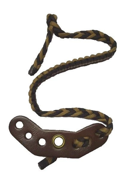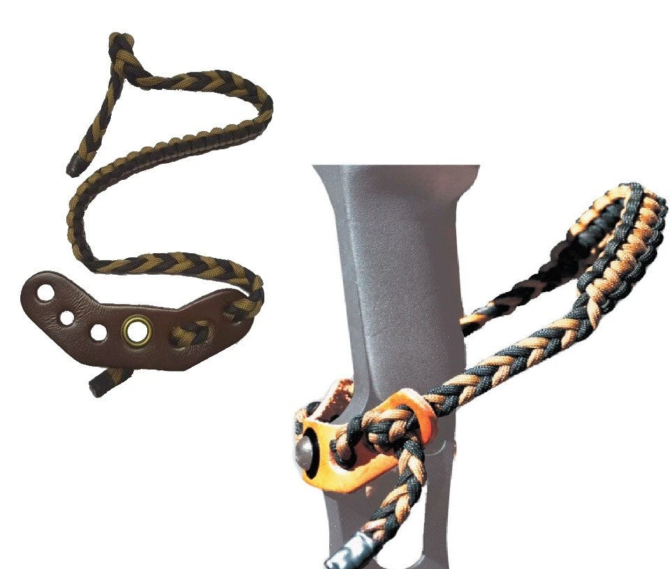 Geflochtene Bogenschlinge mit Ledergurt, welche in der aufgerichteten Position verbleibt. Passend für jede Hand und jedes Griffstück.